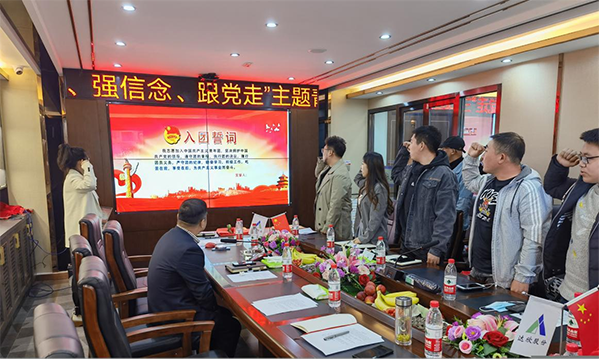 活动首先重温了入团誓词,观看党的故事100讲-五四运动、达欣集团党史发展纪录片。随后,优秀青年代表进行了慷慨激昂的“我为建党100周年献礼”发言以及青年突击队授旗仪式。为活跃现场气氛,还进行了击鼓扬花唱红歌趣味小游戏。